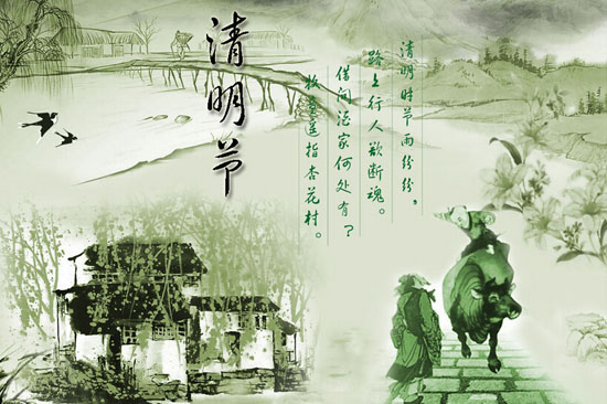 清明节,雨纷纷,路上人,欲断魂。问酒家,何处有?牧童指,杏花村。