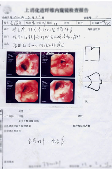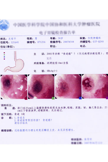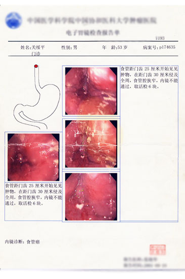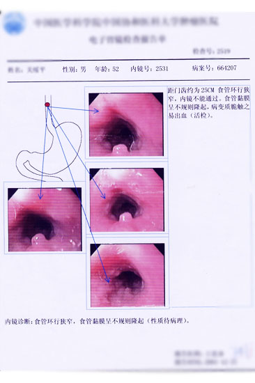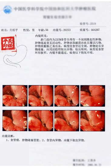 2005年6月23日,中科院医科大学检查,食管内镜诊断:食管癌,肿物堵塞管腔。内镜号26253,检查号2519。当时医生也没有好的办法,认为我几年前未做手术活到今日已是奇迹,由于当初失去了手术机会,现在肿瘤又堵满管腔,滴水不进。目前也没有其他医治办法。医院又一次宣判了我的死刑,为了几个问号,几乎丧失了生命。