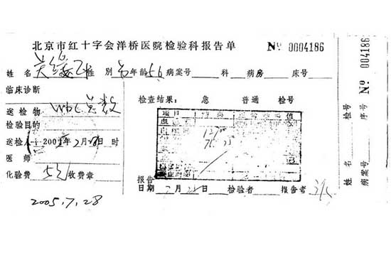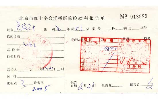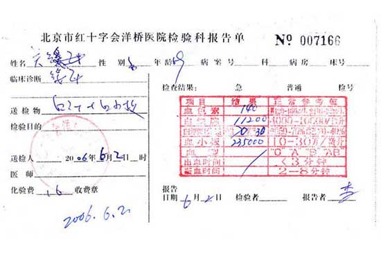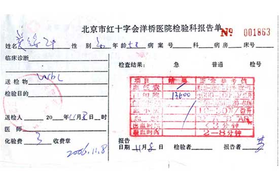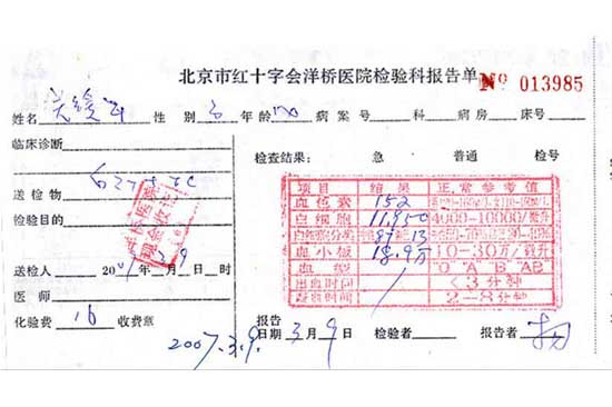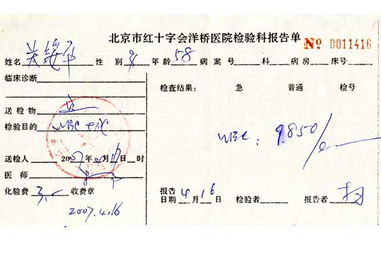 由于蜂疗的结果,我几年来白细胞计数一直都很高,我的免疫功能强,面部气色好看,体力充沛,几年来最热的夏季也没睡过午觉,我住的七层没有电梯,但我可扛上百斤的物品上七楼,比年青人还有耐力。我将几年的化验、单白细胞计数提供几张以供参考。