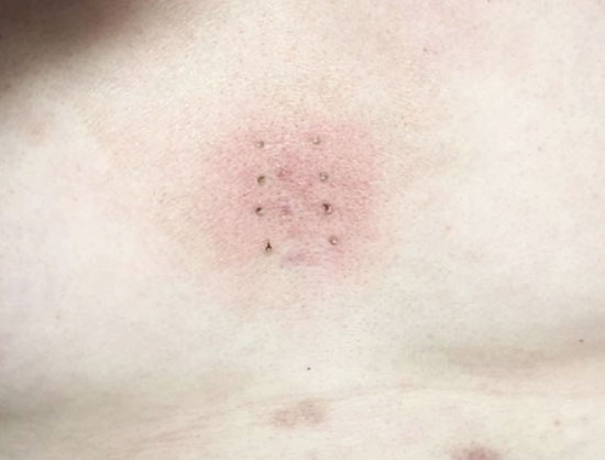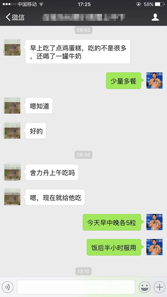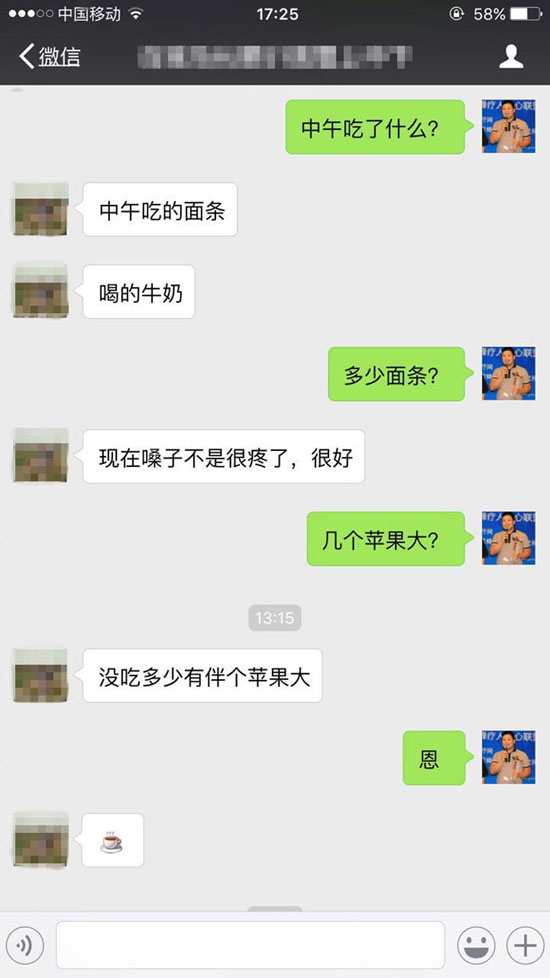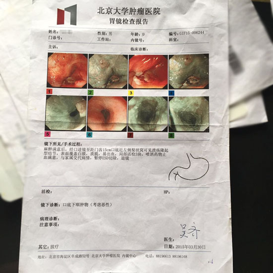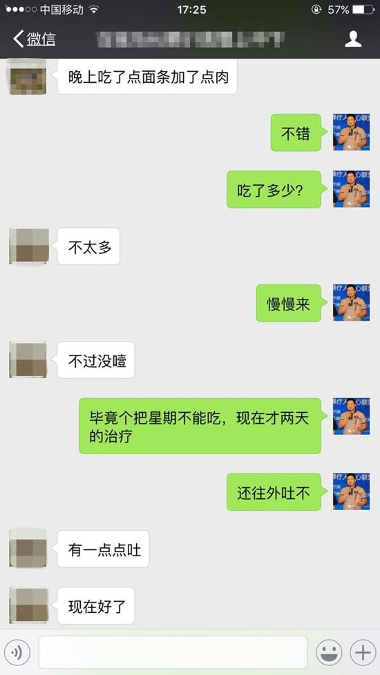 食道癌上中下段患者,51岁,蜂疗前已1周未进食,只能喝牛奶,一罐牛奶得分几次才能喝完,距门齿15cm处疼痛,33cm处梗阻,呃逆,吐浓痰,眠差,乏力。5月14日8针,第二日能吃少许面条;5月15日16针,第三日能吃半个苹果大的面条与肉、及牛奶与蛋糕……见效神速!今天患者脸上有了些许笑容,嗓子也不疼了,呕吐基本解除!