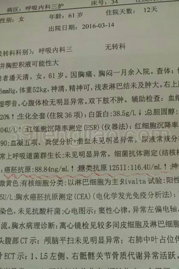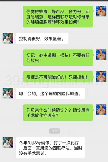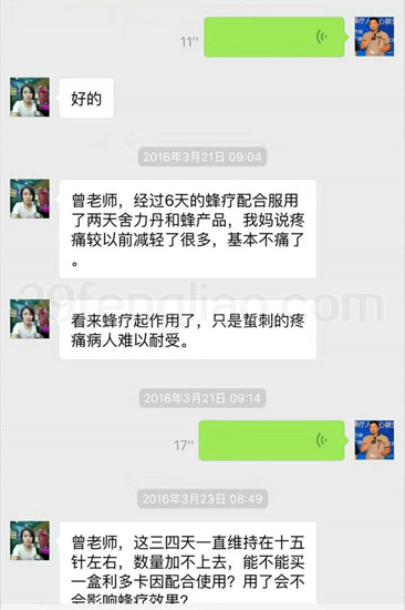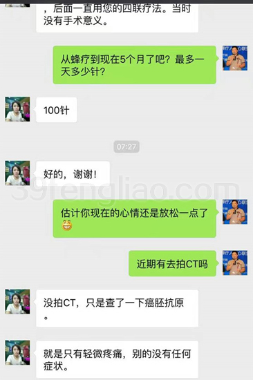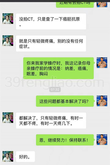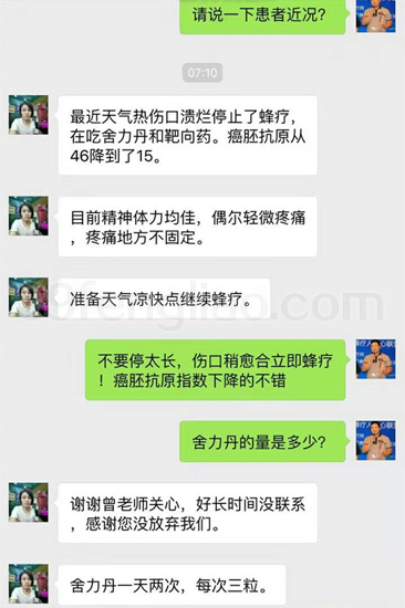 湖北的潘阿姨,肺腺癌晚期,经5个月蜂疗,癌胚抗原指数持续下降:3月初88.84,4月29日48.56,近期指数15!蜂疗前症状表现:纳差、癌痛、眠差、胸闷,现在这些症状基本解决,目前还有点轻微疼痛……抗癌路艰辛!!不绝望才有希望!