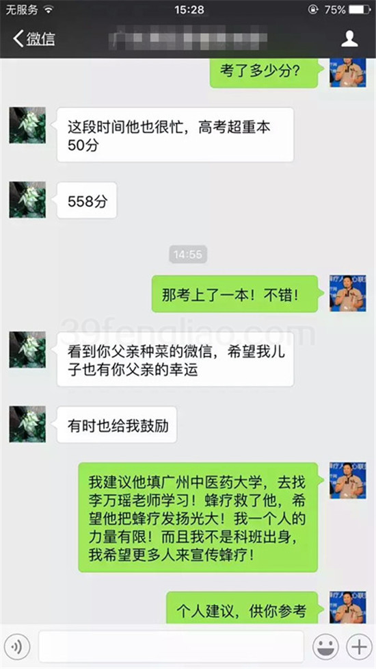 广东清远嗜铬细胞瘤患者小欧,今年19岁,前五张照片是今年元月份所截屏,后四张是今天的截屏!从开始小欧的父亲剧烈反对蜂疗,到今天的督促儿子蜂疗!开始广东省肿瘤医院的名中医骂小欧的母亲给儿子蜂疗,导致患者停止蜂疗半年,后来因病情的发展,中西医束手无策下不得不蜂疗!而今日,蜂疗救了他,高考成绩558分!超过重点本科50分的优异成绩!真心的祝福!同时我的心很凉!可想而知,民间疗法-蜂疗的发展举步维艰!!责任巨大!我将继续前进!何惧艰难险阻……