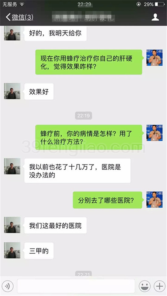 肝硬化患者有了超好的治疗方案--蜂疗!这几年来用蜂疗治疗的一些肝硬化患者,效果均不错,而且都是西医治疗不理想而选择蜂疗的。要知道肝硬化控制不好,下一步就是肝癌!!蜂疗可以治疗许多疾病,但绝不是万能的,也无法包治百病!世界上也没有哪一种疗法对某种疾病是百分百有效……均有显效率、有效率、无效率、痊愈率等!各位朋友要多多了解蜂疗!千万不要误读蜂疗!