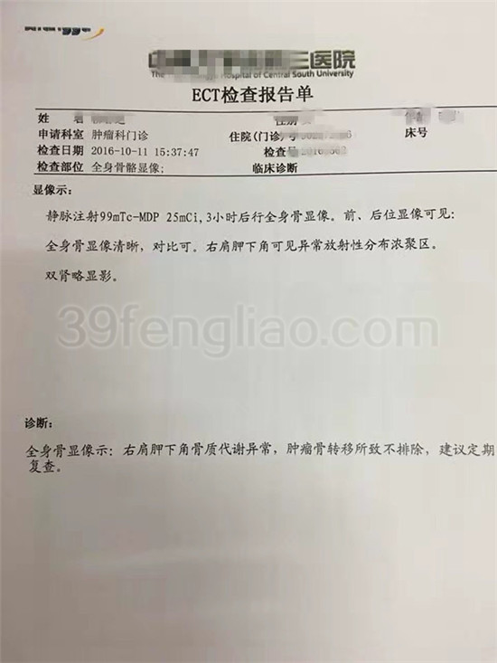 晚期肺癌患者,女,59岁,长沙中南大学湘雅三医院CT检查:考虑右肺中央型肺ca,并右肺中、下叶不张,肺内转移,纵隔及右肺门多发淋巴结转移可能,右侧胸腔积液。临床症状表现为:干咳、乏力、纳差、眠差、呼吸可、大小便可,经过近三个月的蜂疗综合抗癌疗法,患者目前症状基本解除,病情稳定……希再接再励!坚持蜂疗!提高生活质量、延长生命!