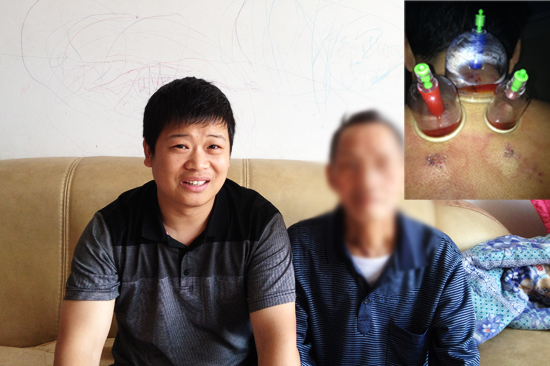曾伟为晚期肺腺癌患者蜂疗后,父亲病前和病后的对比照(左:蜂疗后 右:蜂疗背部)