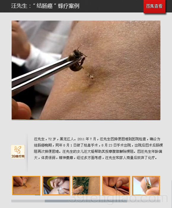2011年9月初,开始给其蜂疗抗癌,在这期间,经过不断的鼓励和指导,患者慢慢适应的蜂疗,面色慢慢红润,体重增加。入冬后,东三省的蜜蜂很难找,不便蜂疗,于是汪大姐带着父亲到三亚,继续得以蜂疗。