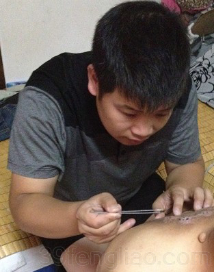 曾伟正在给父亲进行蜂针治疗,看着蜂疗给父亲带来的效果,这么多年一直坚持着。