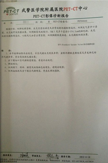 2012年4月10日刘先生所做CT诊断报告被诊断出恶性淋巴瘤