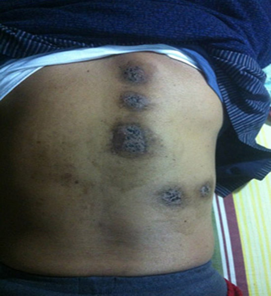 肝癌患者席先生,56岁,河南人在进行蜂针治疗后背部的照片
