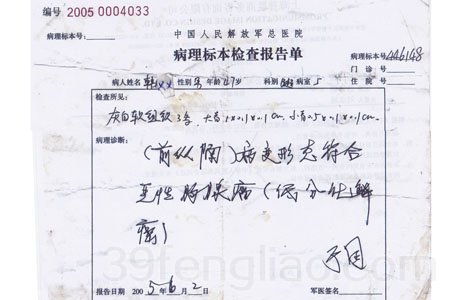 在解放军总医院,老韩接受了全面检查,其他老战友拿着健康的报告单欢欢喜喜地回去了。只有他被医生留了下来。老韩心里有一种不好的预感,他急忙问:“大 夫,我咋啦?是不是得了啥病啊?”医生把报告单递到韩胜军的手中,“您最好要有个心理准备,我们怀疑是恶性胸腺瘤!”“瘤?”听到这个字,韩胜军呆住了, 目光落到了报告单上:“前纵隔病变形态符合恶性胸腺瘤(低分化鳞癌)”。白纸黑字,不由得他不信。“以我的经验,八九不离十了,您还是赶紧回家取钱来治病 吧,这个病可耽误不得。”医生安慰他说……