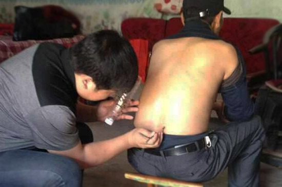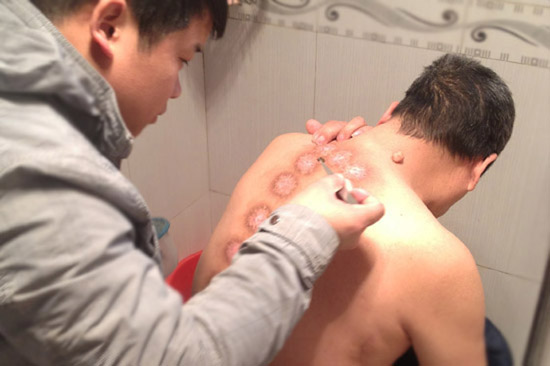 患者儿子曾伟在为患者进行蜂疗