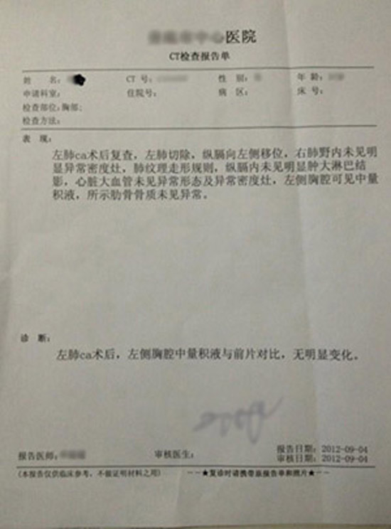 2012年8月患者被确诊为肺腺癌,遂行手术切除。2012年9月4日术后做CT复查,检查报告单示:左肺癌术后复查,左肺切除,纵膈向左侧移位,右肺野内未见明显异常密度灶,肺纹理走形规则,纵膈内未见明显肿大淋巴结影,心脏大血管未见异常形态及异常密度灶,左侧胸腔课间中量积液,所示肋骨骨质未见异常。