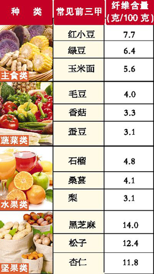 米饭和馒头是人们最常吃的主食,可如果顿顿不离它们,就不利于补充膳食纤维。现代生产工艺的进步,致使大米和面粉越来越精细,虽然做出来的食物口感更细腻,却流失了大量膳食纤维。《中国食物成分表》显示,每100克大米所含的膳食纤维仅为0.7克,比小米(1.6克)、鲜玉米(2.9克)、莜麦面(4.6克)、玉米面(5.6克)、黑米(3.9克)少很多。另外,杂豆类和薯类也富含膳食纤维,比如红小豆(7.7克)、绿豆(6.4克)、红薯(1.6克)。