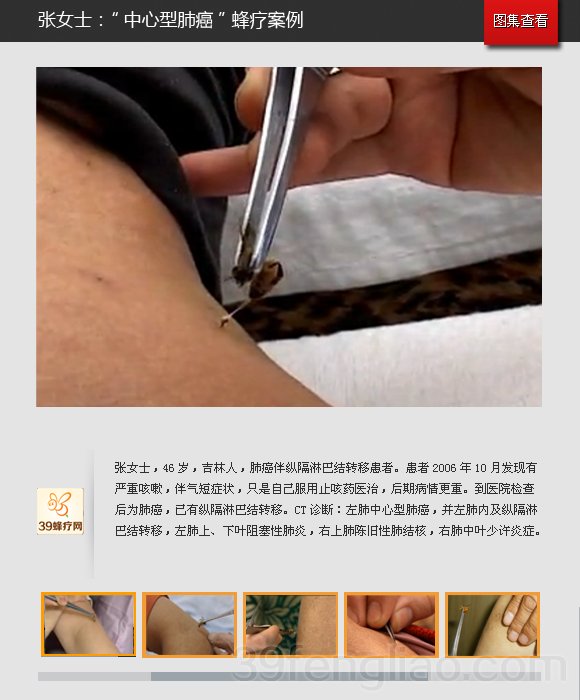 每天由进蜂针数量的增加,一周可用60—80只,每天口服注射液3种,半个月后已停止了原来每天打吊瓶的日子。一个月后,患者可下地走动了,这就更增强了患者和家属抑癌的信心和勇气。后来蜂针增加到100多只,而且天天不间断。