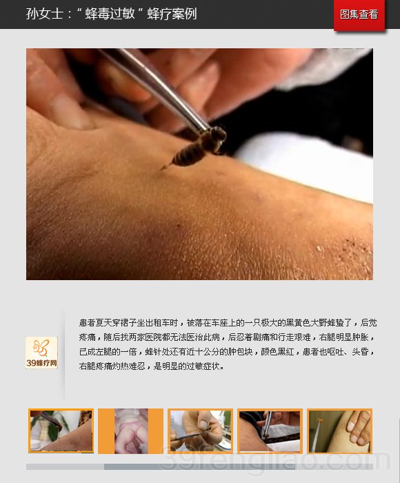 患者夏天穿裙子坐出租车时,被落在车座上的一只极大的黑黄色大野蜂蛰了,后觉疼痛,随后找两家医院都无法医治此病,患者最后找到义诊蜂疗点看有没有办法。