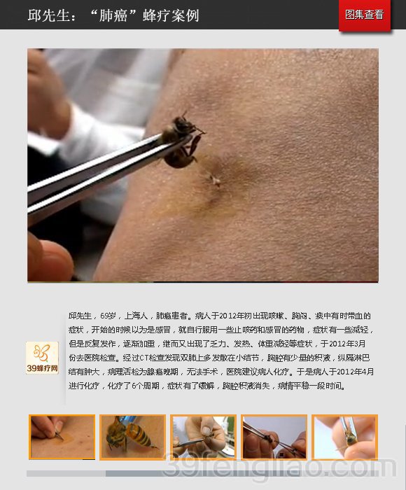 治疗3个月后,胸水减少,经CT 检查肿瘤没有发展,疼痛减轻,病情得到了控制,现在病人继续进行蜂疗。