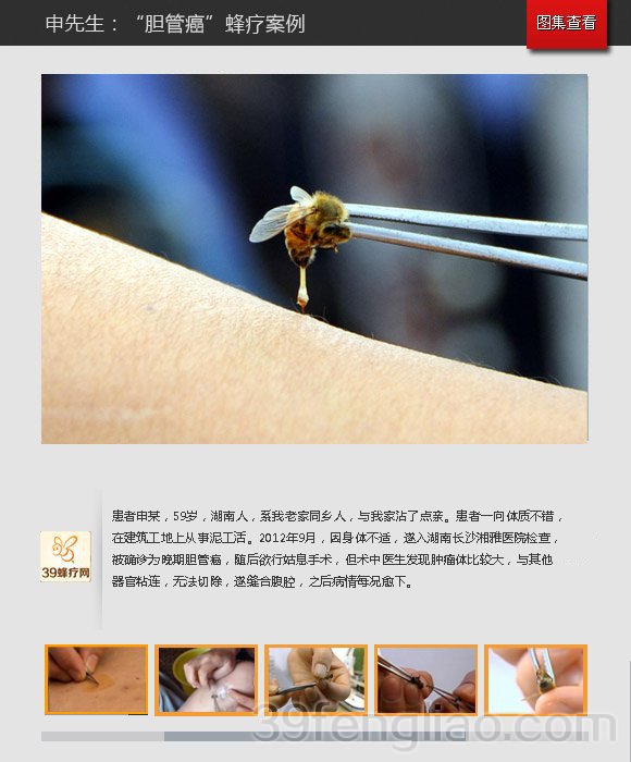 2012年11月下旬,我和父亲回老家,患者的儿子知道我用蜂疗治疗父亲的晚期肺腺癌后,找到我:“舅,你能用蜂疗治一下我爸爸吗?“我简单问了下病情,摇了摇头:”病情太重,建议放弃治疗吧。”他不死心:“舅,死马当活马医,试试吧,总比在家等死强吧。”我不忍心拒绝他,答应试试,恰好村子里有养蜂的,抓来蜜蜂后,来到患者家。患者已经卧床,腹部插着引流管,每日下午癌性热,纳差(胃口不好),睡眠差,乏力,黄疸,腹胀,下肢水肿,面黄肌瘦,躺床上呻吟不已,见到我后都无力打招呼。待详细了解病情后,先教其儿子试针,并给患者制定了全套综合治疗方案,嘱其儿子遵照执行,先试着治疗半个月,如见效就坚持,不见效就再放弃。