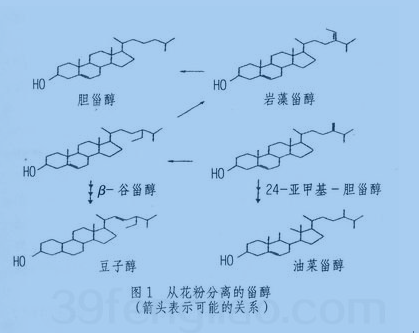 国际上Koesslor最早研究花粉中甾醇类物质,认为甾醇类数量和类型在不同的花粉中其含量不同,他发现玉米花粉含甾醇类物质大约0.1%,主要是胆甾醇和一些豆甾醇。Bennett等从花粉中分离出雌酮和胆甾醇,Hoeberichts从玉米、黑麦、山地松、梯牧草、胶桤木和鸭茅的花粉分析出游离的脂甾醇,Dungworth从Pinus pinaster花粉分析出束缚的甾醇类和醇类比游离的多出15%,Stamdife等对15种花粉进行含甾醇类的研究,从研究的结果看,向日葵花粉含有β一谷甾醇(40%);蒲公英花粉含胆甾醇(91%);森林海棠花粉含24-亚甲基-胆甾醇(12%)、豆甾醇(12%);黑麦花粉含24-亚甲基-胆甾醇(49%)、犀-谷甾醇(13%);欧洲赤松花粉则含有β-谷甾醇(54%)、24-亚甲基-胆甾醇(9%)。Derys从蒲公英花粉分离出一种14-甲基甾醇;Derys和Barbeis研究玉米花粉甾醇中类三萜角胶油萜达0.02%,其他种类的甾醇也存在;C29甾醇类是棕搁花粉甾醇中最丰富的成分。Barhir从仙人掌花粉测出一种可能是花粉甾醇的前身物质环三萜醇31一E环阿顿醇,仙人掌花粉的甾醇94%是24-甲烯胆甾醇,几种普通花粉含甾醇的化学关系如图。