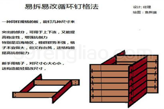 养蜂人在多年养蜂实践中总结经验,根据中蜂生物学规律,结合老式土养方式。创新发展了适合中蜂养殖格式蜂箱----------简称---====格子箱