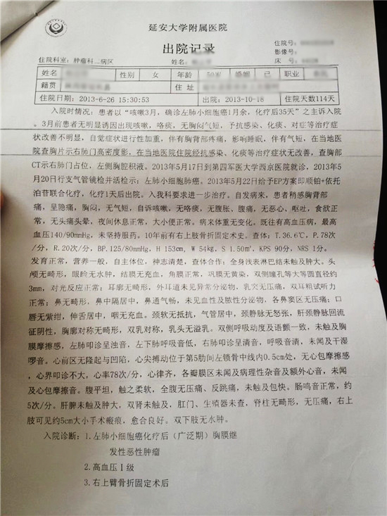 患者病例及治疗进程:杨阿姨,今年56岁,在2013年5月20日被第四军医大学西京医院确诊为左肺小细胞肺癌,无手术机会,只能化疗。后转入延安大学附属医院继续化疗,入院时诊断:左肺小细胞肺癌化疗后(广泛期)胸膜继发性恶性肿瘤,连续住院114天,化疗8次……化疗产生的副作用对杨阿姨影响极大,杨阿姨身体异常虚弱,面黄肌瘦,身体虚弱,走路需要家人搀扶,并伴有呕吐和食欲不振2014年3月23日,杨阿姨家属邀请曾伟老师进行上门诊疗。在曾伟老师为杨阿姨制定了蜂疗综合治疗方案后,家人严格执行,致使病情得到好转。