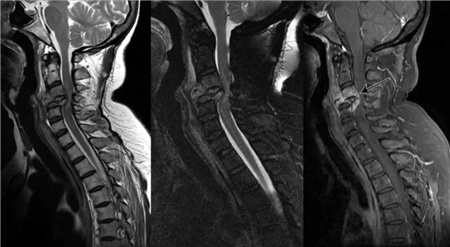 (1)临床上出现颈脊髓损害的表现。多数患者首先出现一侧或两侧下肢麻木、沉重感,随后逐渐出现行走困难,下肢肌肉发紧,随后出现行走困难,严重者步态不稳、行走困难,双脚有踩棉花感。部分患者可出现膀胱和直肠功能障碍。如排尿困难、尿频、尿急等。