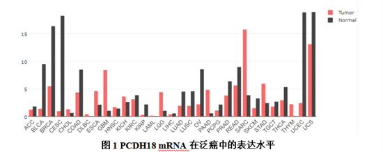 PCDH18 mRNA在宫颈鳞状细胞癌和腺癌、乳腺癌、膀胱尿路上皮癌、脑胶质瘤、肺腺癌、卵巢癌、子宫内膜癌、肺原发性腺癌中等均高表达(P<0.05),横坐标表示肿瘤类型,纵坐标表示肿瘤和正常组织的中位表达。见图1。