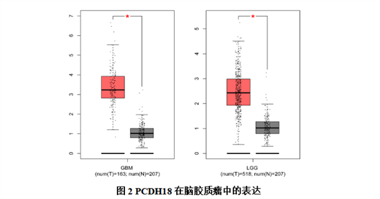 GEPIA数据库分析结果表明,PCDH18在GBM与LGG中,与正常组织相比,其表达量均上调,且差异有统计学意义(P<0.05),见图2。