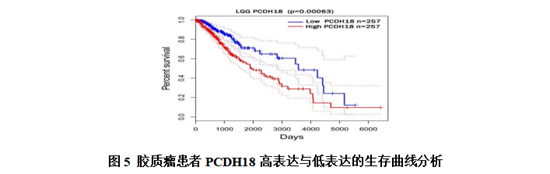 胶质瘤的RNA-seq数据和临床数据来源于TCGA数据库。对TCGA数据库中脑胶质瘤患者的预后进行Kaplan-Meier分析,并绘制生存曲线。K-M曲线显示,PCDH18高表达的LGG患者中位生存时间降低(p<0.001),见图5。