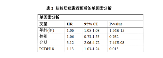 单因素独立预后分析显示,年龄(p<0.001)、肿瘤分级(p<0.001)、PCDH18(p<0.05)基因表达水平差异显著(表2)。这表明年龄、分期和PCDH18基因的表达水平是生存的重要预测因素。
