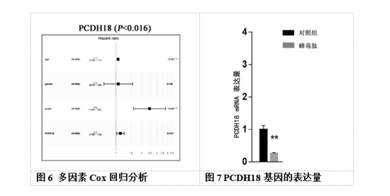 多因素Cox回归分析显示,PCDH18 (p<0.05)的表达是脑胶质瘤的独立预测因子,与胶质瘤患者的生存关系最为密切。见图6。