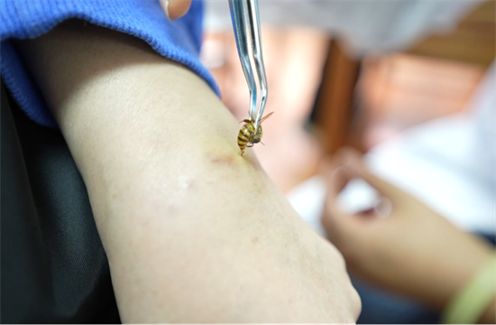 速刺速拔针法:一手抓蜂一手拿镊子,蜂针点到即可拔蜂针针体。