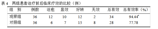 4. 两组患者治疗前后临床疗效比较 见表4。