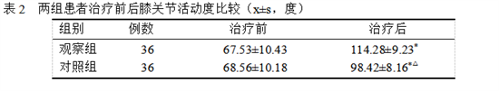 2.观察指标 分析比较观察组与对照组在治疗前后的膝关节活动度、疼痛情况、骨关节炎评分指数及总体临床疗效的改善情况。