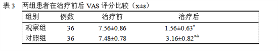 注:两组患者分别于治疗前后VAS评分,与本组治疗前比较,*P<0.05;与对照组同期比较,△P<0.05。观察组膝关节VAS评分的改善均优于对照组,说明蜂针输穴疗法改善膝关节VAS评分优于常规口服西药治疗。