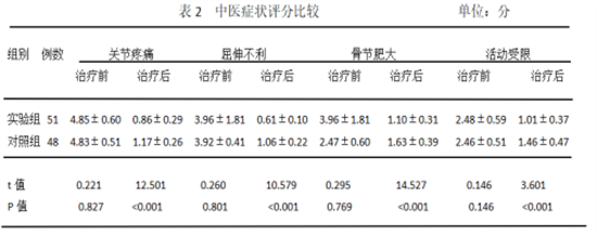 两组患者中医症状评分比较与治疗前比,治疗后关节疼痛、屈伸不利、骨节肥大、活动受限等各项评分均降低,且治疗后实验组相比对照组各项中医症状评分数据前者处于更低水平,P<0.05差异有统计学意义。