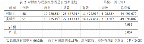 1.3.1中医症候积分比较对两组患者治疗前后中医症状评分依据《中医临床病证诊断疗效标准》进行评估:关节疼痛、屈伸不利、关节肿胀、骨节肥大,每项总分均为 6分,得分越高患者的临床症状严重程度越严重。根据中医证候疗效指数评定标准评定患者的中医证候疗效评定标证候标,采用尼莫地平法,积分变化%=-(试验前积分-试验后积分)/试验前积分x100%[[]]。1.3.2临床疗效比较:治疗后临床疗效,参考《中医临床病证诊断疗效标准》[[]]评估:临床治愈为治疗后,患者多种临床症状均完全消失,膝关节疼痛及肿胀消失,关节恢复正常活动,疗效指数≥95%;显效为治疗后,患者膝关节疼痛及肿胀基本消失,关节功能基本正常,70%≤疗效指数<95%。膝关节受到的限制并不明显,肿胀轻微的情况;缓解为治疗后,临床症状部分消失,膝关节疼痛、活动不利等症状明显减轻,肿胀较轻,关节功能改善,30%≤疗效指数<70%。但膝关节活动仍然受一定的限制,出现较为明显肿胀的情况;无效为治疗四周后,患者没有改善任何临床症状,疗效指数<30%。总有效率=(临床治愈+显效+有效)例数/总例数×100%。1.3.3膝关节功能恢复情况比较评估两组治疗后关节功能:对膝关节功能依据Lysholm膝关节评分标准行症状分级[[]],Lysholm评分量表共10个项目内容,包括疼痛、下蹲、跑步、上下楼梯、关节活动度、支具、跛行、步行能力、关节囊肿积液、股四头肌萎缩等,每个项目的分值的范围为0~10分,总分0~100分,最后总分得分越高代表患者膝关节功能越好。95~100分代表关节功能恢复优秀;84~94分表示关节功能恢复良好;65~83分表示关节功能恢复合格,评分<65分表示膝关节功能恢复较差。1.3.4关节压痛视觉模拟量表(visualanaloguescale,VAS)评分、关节肿胀VAS评分[[]]。治疗前后分别评估两组的疼痛程度,采用VAS判定,总分10分,重度疼痛7~10分;中度疼痛4~6分;轻度疼痛1~3分,;无疼痛感0分,得分越低,则代表患者疼痛感越轻。评分越高表示病情越重。疗效指数=(治疗前综合评分-治疗后综合评分)/治疗前综合评分×100%。综合评分=关节压痛VAS评分+膝关节疼痛VAS评分+关节肿胀VAS评分。