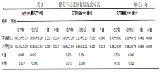 比较治疗前后两组膝关节Lysholm评分,压痛VAS评分、关节肿胀VAS评分,此三项结果均低于治疗前,差异有统计学意义(P<0.05)。治疗后实验组Lysholm评分 、膝关节压痛VAS评分、关节肿胀VAS评分相比于对照组,差异有统计学意义(P<0.05)。