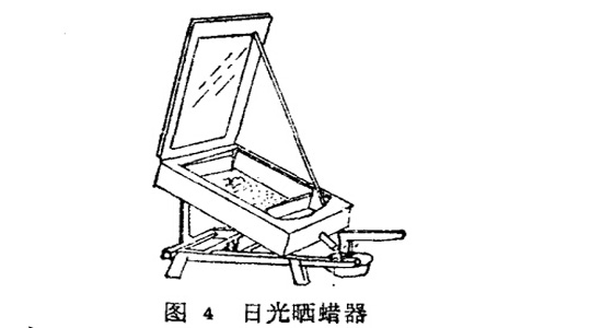 本方法十分简单,即将巢脾等放在晒蜡器的底盘上,盖上玻璃盖,置于日光下曝晒,蜡熔化后经纱盘过滤,流人承蜡槽中,冷凝成蜡块。虽然利用太阳能加热熔蜡、成本低,但蜡渣中蜡的残留量大,提取率低。
