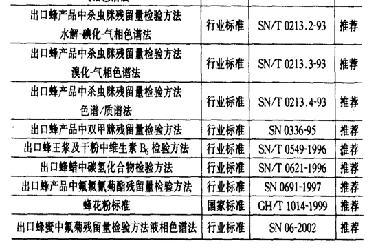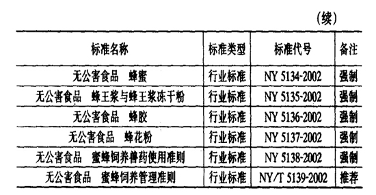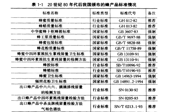 中国蜂产品的标准化工作始于20世纪60年代中期,至20世纪80年代有长足进步。到1991年,蜂王浆、蜂花粉、蜂蜜、蜂蜡等主要蜂产品均已颁布国家或行业标准。2002年7月农业部又制定了蜂王浆、蜂花粉、蜂蜜、蜂胶等主要无公害蜂产品的行业标准,已于同年9月颁布实行。国家标准主要为蜂蜜包装、蜂蜜卫生标准蜂王浆标准、辐照花粉卫生标准、蜂花粉标准及蜂蜜中四环素族抗生素残留量的测定方法及限量标准,其余为农业部、商业部、进出口商品检验检疫局的行业标准(表11)。