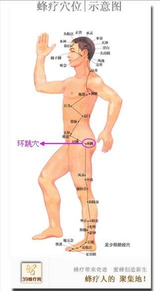 环跳穴位于人体的股外侧部,侧卧屈股,当股骨大转子最凸点与骶管裂孔连线的外三分之一与中三分之一交点处。