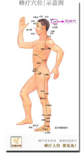 天冲穴位于人体的头部,当耳根后缘直上入发际2寸,率谷穴后0.5寸。