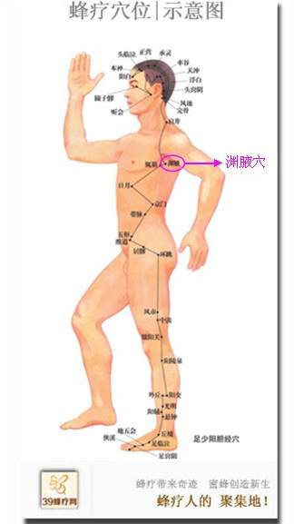 渊腋穴在侧胸部,举臂,当腋中线上,腋下3寸,第四肋间隙中。