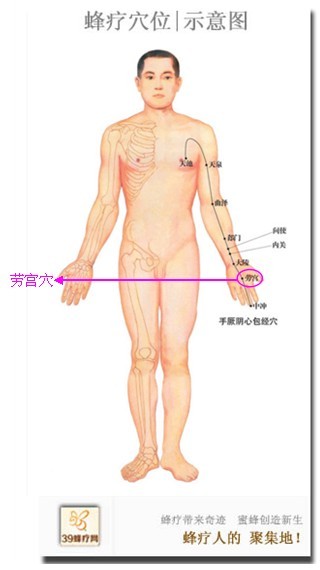 劳宫穴位于人体的手掌心,当第2、3掌骨之间偏于第3掌骨,握拳屈指的中指尖处。