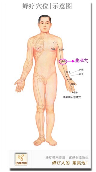 曲泽穴 位于人体的肘横纹中,当肱二头肌腱的尺侧缘。