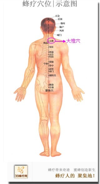 大椎。大,多也。椎,锤击之器也,此指穴内的气血物质为实而非虚也。大椎名意指手足三阳的阳热之气由此汇入本穴并与督脉的阳气上行头颈。本穴物质一为督脉陶道穴传来的充足阳气,二是手足三阳经外散于背部阳面的阳气,穴内的阳气充足满盛如椎般坚实,故名大椎。