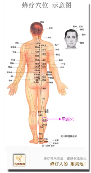 承筋穴 位于人体的小腿后面,当委中穴与承山穴的连线上,腓肠肌肌腹中央,委中穴下5寸。
