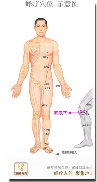 曲泉穴的主治病症为:月经不调,痛经,白带,阴挺,阴痒,产后腹痛,遗精,阳痿,疝气,小便不利,头痛,目眩,癫狂,膝膑肿痛,下肢痿痹。