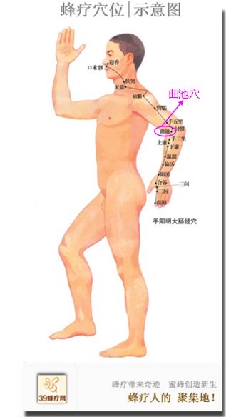 取该穴道时患者应采用正坐,侧腕的取穴姿势,曲池穴位于肘部,寻找穴位时曲肘,横纹尽处,即肱骨外上髁内缘凹陷处。