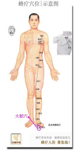 大都穴在足内侧缘,当足大趾本节(第1跖趾关节)前下方赤白肉际凹陷处。