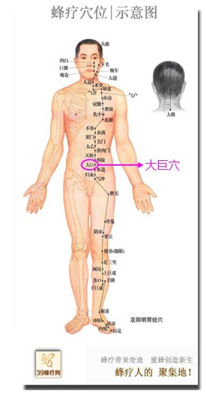 大巨。二词合解,指穴内气血物质所占据的区域为大为巨。本穴物质为外陵穴传来的地部水液,其下传之水为脾土中的外渗之水,来源及流经区域巨大,如同巨大的浅溪,故名大巨。